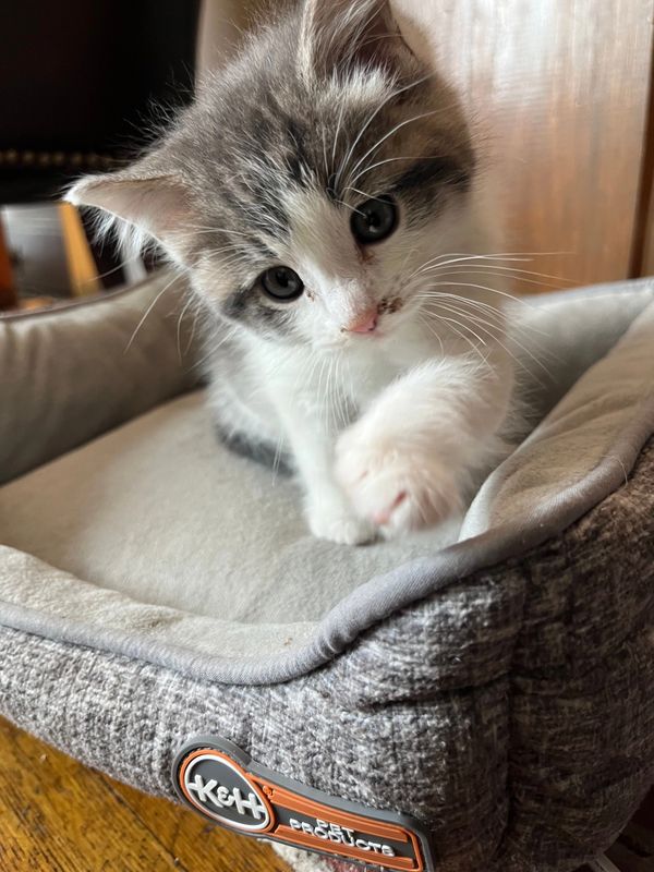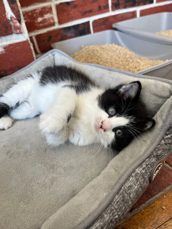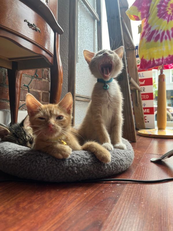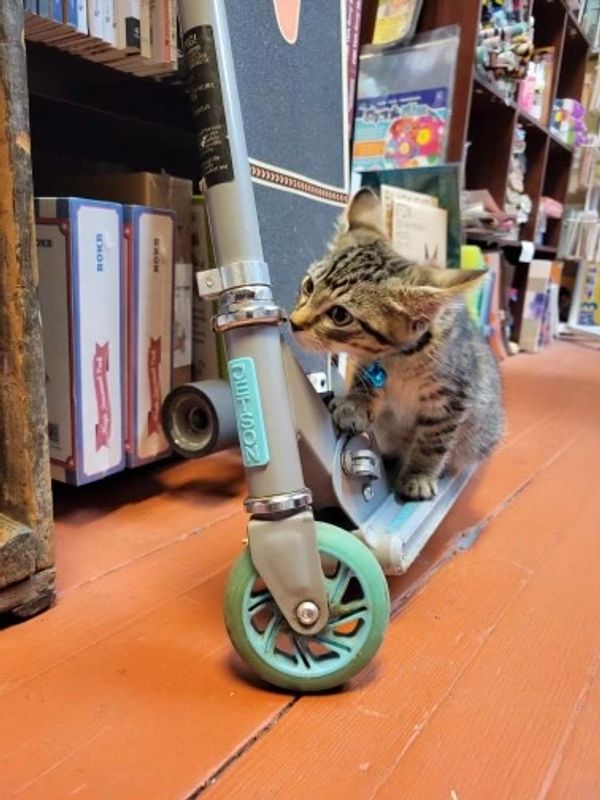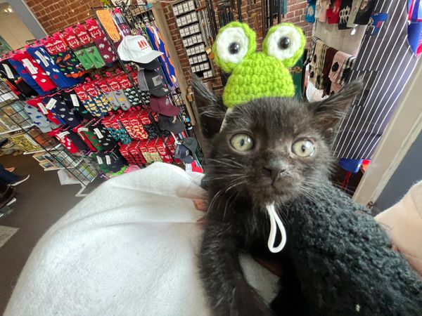 Our current shop cat, Gibby the Six-Toed Menace. Gibby came from our very first litter that we fostered through Ten Lives Club. This teeny tiny little alien of a kitten won all of our hearts and now he's Thin Ice's newest icon.